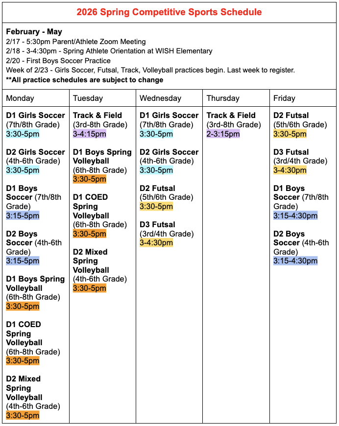 WISH Charter Spring Sports Season runs March-May Registration Open 2/2/26 First Practices - 2/12 - 2/30